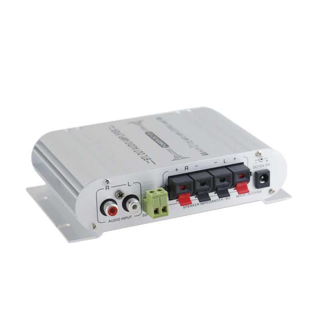 Fitur Hi-Fi Stereo Audio Amplifier Nikmati kualitas suara yang dahsyat dan jernih pada audio mobil Anda. Dengan amplifier ini, Anda dapat mengatur besar suara, bass, dan treble dari lagu yang sedang Anda dengar. Amplifier ini memiliki port input stereo untuk speaker left dan right.