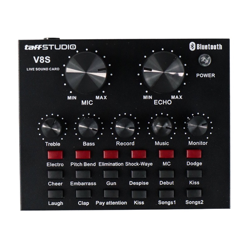 Audio USB external soundcard ini berguna untuk membuat efek-efek suara elektronik artifisial dan efek suara secara live dari mikrofon Anda. Biasa digunakan untuk broadcast dan streaming secara live di berbagai platform seperti YouTube, Twitch, Instagram, dan lainnya. Soundcard V8S ini dapat digunakan melalui koneksi bluetooth sehingga dapat terhubung ke komputer, laptop maupun smartphone tanpa perlu kabel lagi, cocok untuk kelengkapan podcast. Fitur 112 Suara Elektrik, 18 Efek Suara dan 6 Mode Efek Audio USB external soundcard ini dapat menghasilkan suara elektronik sebanyak 112 macam, efek suara sebanyak 18 macam dan mode efek sebanyak 6 buah. Berbagai pilihan suara ini membuat kualitas broadcast Anda semakin menarik sehingga penonton Anda akan semakin senang menonton Anda. Tombol Kontrol Pada sound card ini juga terdapat beberapa kendali suara antara lain echo, treble, bass, record volume control, music volume control dan monitoring volume control (fungsi earphone). Untuk mematikan suara mikrofon saat sedang live, harus mematikan 3 volume yaitu mic, record dan music. Koneksi Bluetooth Soundcard V8S ini menggunakan koneksi bluetooth sehingga dapat terhubung ke komputer, laptop, smartphone dan perangkat lainnya tanpa perlu kabel lagi. Hal ini membuat soundcard ini lebih leluasa untuk diletak di meja komputer Anda. Mendukung Banyak Platform Dapat digunakan untuk berbagai platform seperti komputer, laptop hingga smartphone. Dengan ini, Anda dapat live melalui beberapa pilihan perangkat.