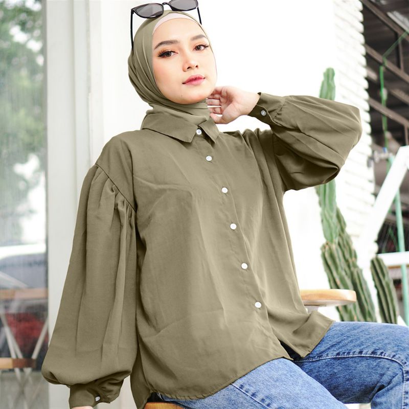 2. AUDREY BLOUSE • Bahan wolfis • Lengan model balon • Berkerah • Full kancing
