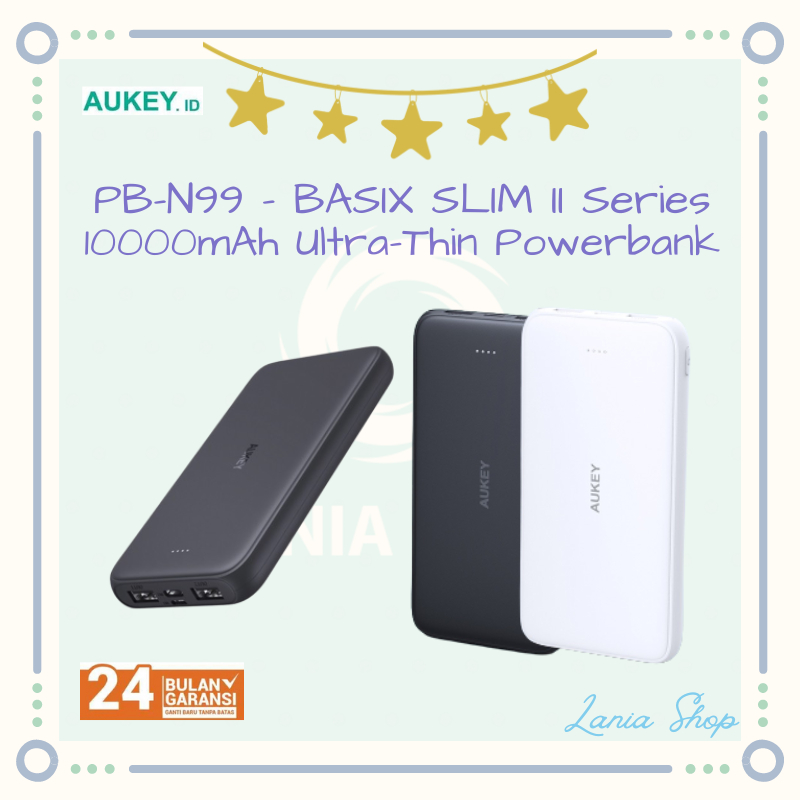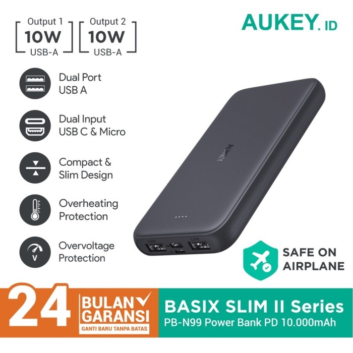 Specification Brand: AUKEY Product Name: BASIX SLIM II Series - 10000mAh Ultra-Thin Powerbank Product Model: PB-N99 Battery Capacity: 10000mAh Battery Type: Lithium Polymer Input (Micro USB): 5V/2A Input (USB-C): 5V/2A Output (USB-A1): 5V/2.1A MAX Output (USB-A2): 5V/2A MAX Max. Power Output: 10.5W