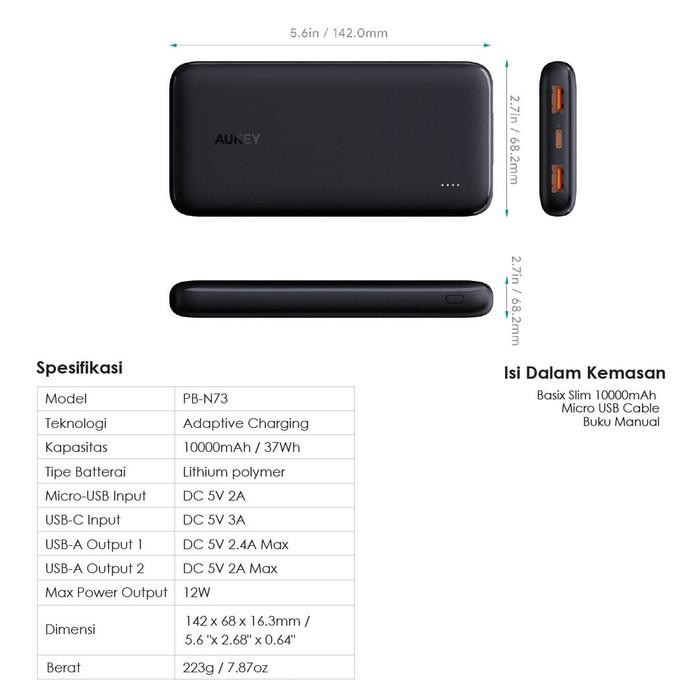 Spesifikasi : Model : PB-N73 Barcode : 500489 Teknologi : Adaptive Charging Kapasitas : 10000mAh / 37wh Tipe Baterai : Lithium Polymer Micro-USB Input : DC 5V 2A USB-C Input : DC 5V 3A USB-A Output 1 : DC 5V 2.4A Max USB-A Output 2 : DC 5V 2A Max Max Power Output : 12W Dimensi : 142 x 68 x 16.3 mm Berat : 400