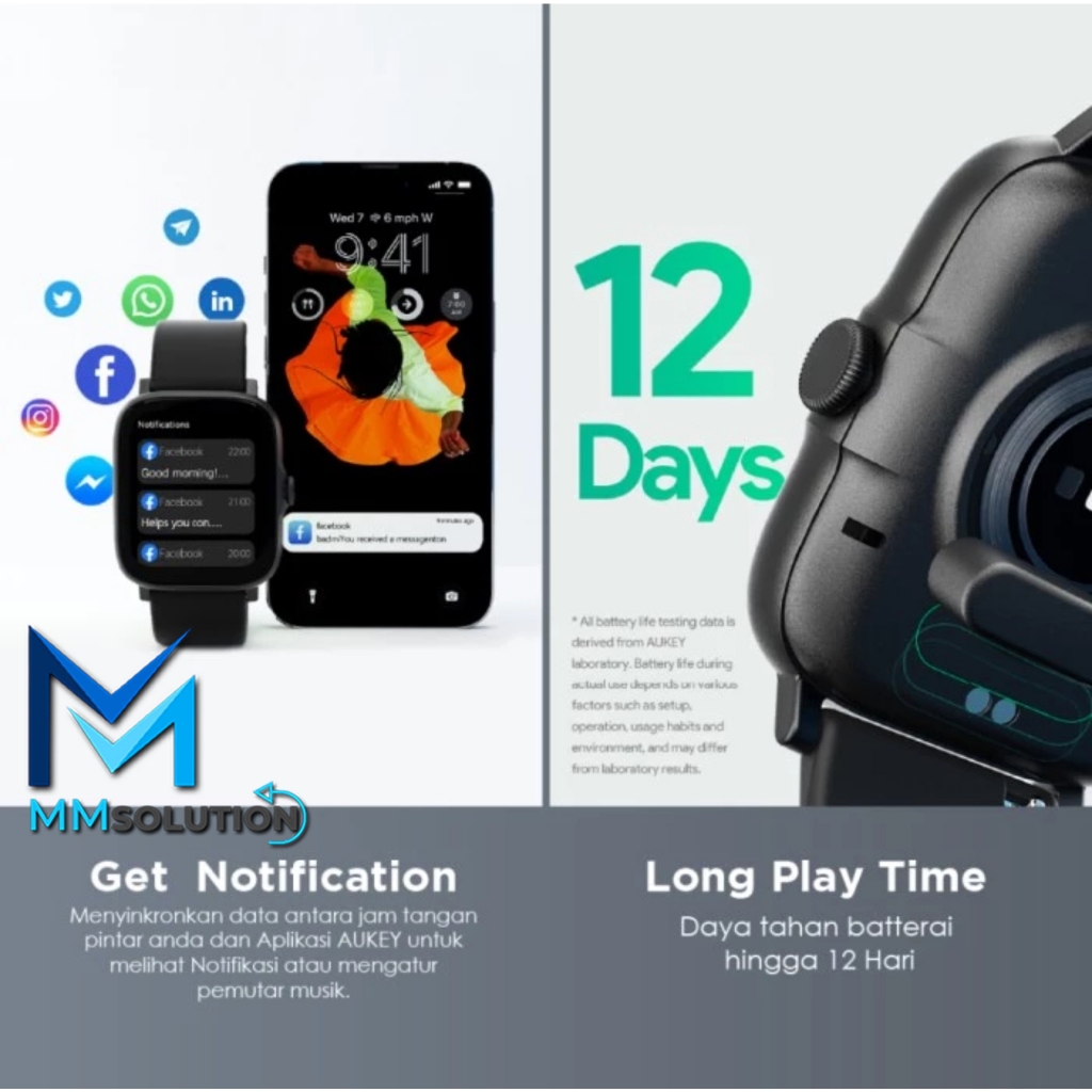 Spesifikasi Model : SW-1P Screen : 1.69 inch TFT LCD Display Resolution : 240 x 280p Bluetooth Version : BLE5.3+BR/EDR Sensor : PPG Sensor , G-Sensor Battery Capacity : 180mAh Li-polymer Battery Life : Up to 12 days Operating Temperature : -5C - 45C / 23F - 113F IP Rating : IP68 System Compatibility : Android 5 / iOs 12 or higher Data Sync Platform : AUKEY Wearable App Watch Body Dimension : 45 x 38 x 9.8mm Watch Strap Width : 22m Weight (Watch Strap Include) : 42g