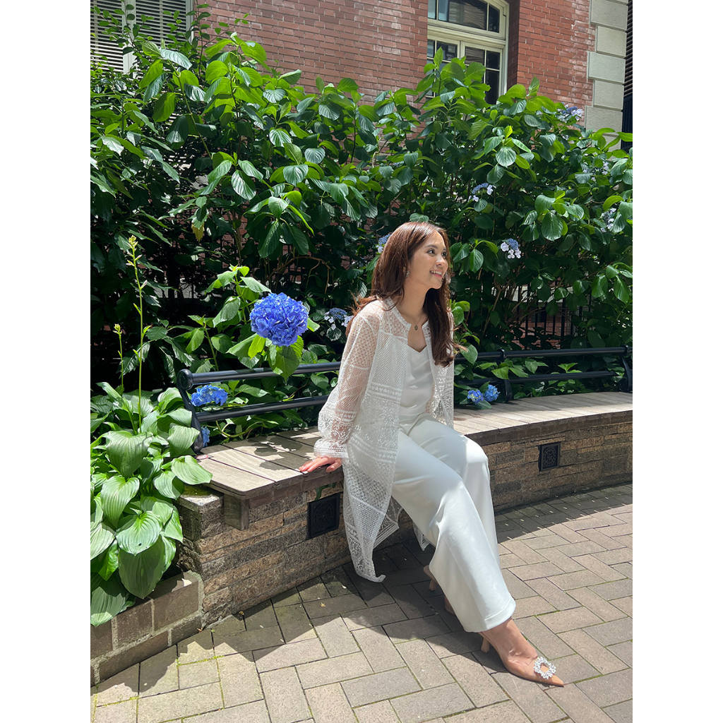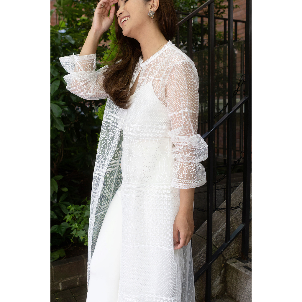 Long outer ini terbuat dari perpaduan embroidery dan tulle. Round neckline dengan dilengkapi detail bordir yang cantik memberikan look yang classy dan mewah. Long sleeves dengan detail kerut di bagian pergelangan tangan membuat penampilan lebih anggun dan feminim. Warna white membuat penampilan terlihat chic dan netral sehingga cocok untuk dipakai di berbagai occasion.