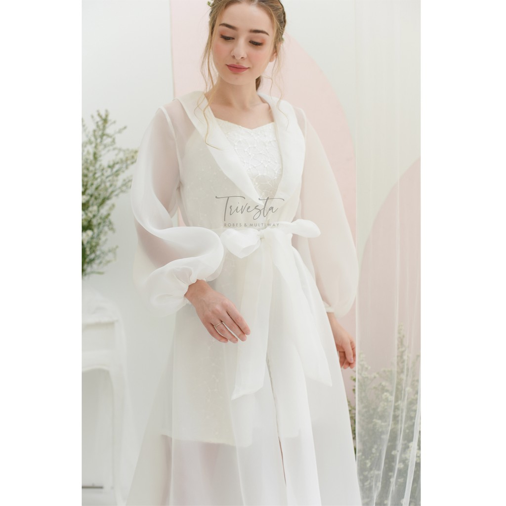 Aurora Robe with inner short IDR 499.000 with inner long IDR 529.000 . Colour : White Fabric Inner : Satin with Lace Fabric Outer : Premium Organza Fabric Belt : Satin (pls take note) Available Size : S,M,L . Inner Short: (ada ring bra, tali pundak bisa diatur, ada sletting) Size S: LD max 82cm ; pjg bdn 88cm; lingkar pinggul 104cm Size M: LD max 88cm ; pjg bdn 90cm; lingkar pinggul 108cm Size L : LD max 96cm ; pjg bdn 92cm; lingkar pinggul 112cm Note: Panjang badan bisa berubah jika tali pundak diatur . Inner Long: Size S :LD 82cm ; pjg bdn 128cm; lingkar pinggul 104cm Size M :LD 88cm ; pjg bdn 130cm ;lingkar pinggul 108cm Size L :LD 96cm ; pjg bdn 132cm ; lingkar pinggul 112cm Note: Panjang badan bisa berubah jika tali pundak diatur . Outer: Size S : LD max 84cm; lingk.pinggang 80cm; pjg bdn 143cm; pjg lengan 63cm; lingkar pergelangan tgn:17cm Size M :LD max 88cm; lingk.pinggang 84cm; pjg bdn 146cm; pjg lengan 65cm; lingkar pergelangan tgn:18cm Size L :LD max 94cm; lingk.pinggang 89cm; pjg bdn 148cm; pjg lengan 67cm; lingkar pergelangan tgn:19cm . READY STOCK / READY TO SHIP/ NO PRE ORDER Motif Brokat mirip/serupa dengan di foto, tidak sama persis. MEMBELI=MENYETUJUI