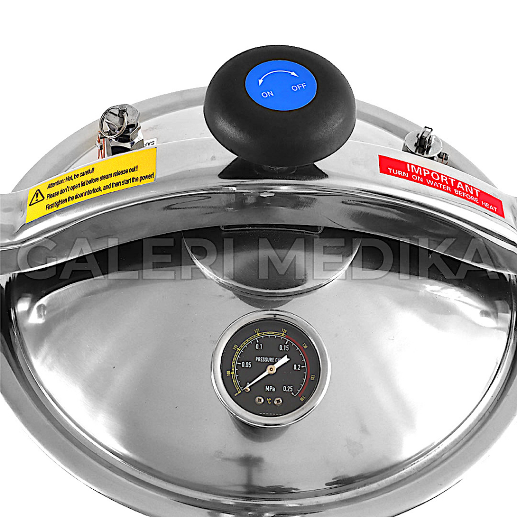 Fitur Produk Fully stainless steel structure Hand wheel type of quick-open door structure Digital display of working status, touch type key Automatically shut off with beep reminding after sterilization Electric heated Easy to operate, safe and realible