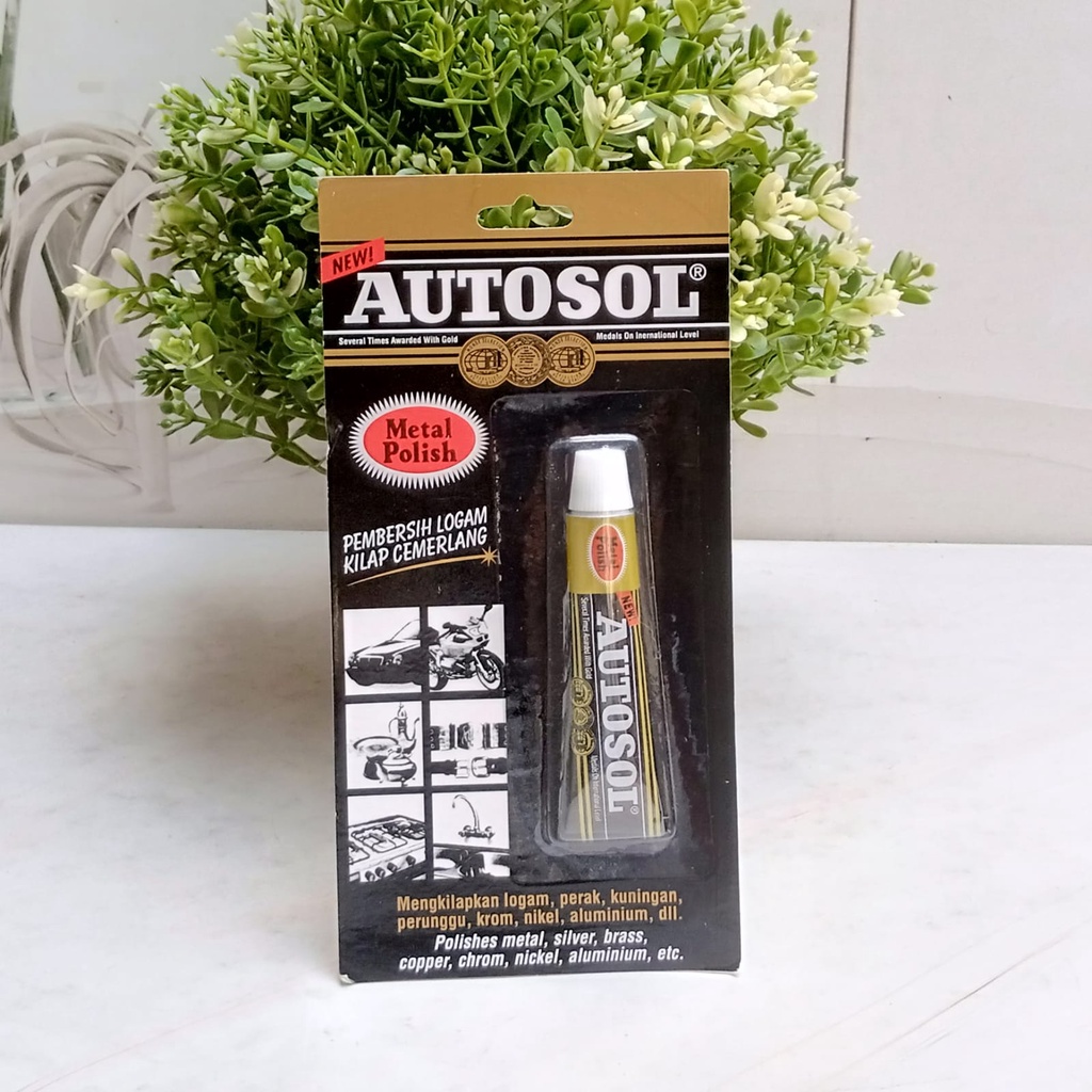 Autosol Metal Polish 15gr Pembersih logam kilap cemerlang merupakan produk khusus special Polish for metal untuk membersihkan dan parts, silver brass, copper, Mengkilapkan segala macam chrome, almunium, nickel, benda yang Terbuat dari etc autosol clena, polishes logam, kuningan, perunngu Krom, almunium, nikel, dll. Autosol juga melindungi dan mencegah Logam dari karatan maupun korosi. * Cara Pakai 1. Oleskan AUtosol pada kain lembut dan bersih 2. Gosokan Kain ke benda yang akan dibersihkan 3. Ulangi sampai hasil yang di inginkan
