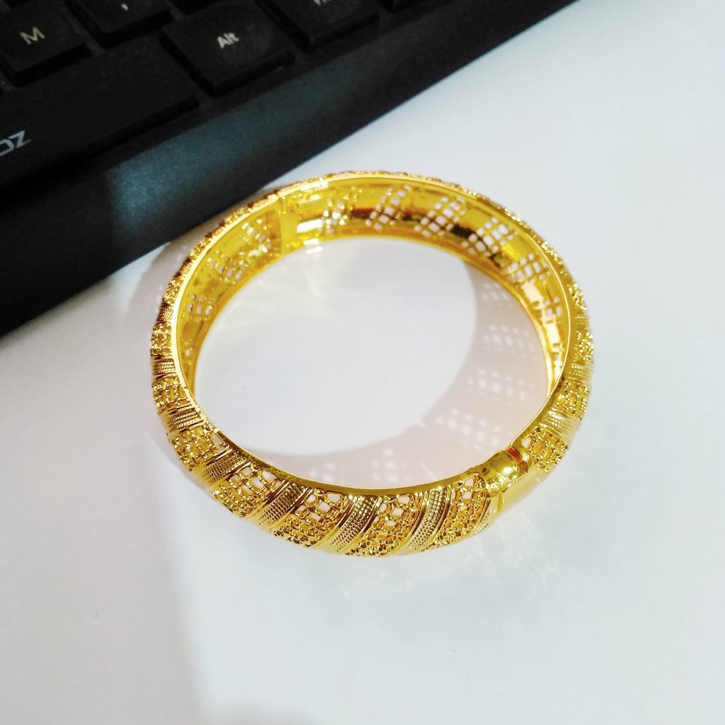 Harga tertera untuk 1 pcs gelang Harga grosir Lebar gelang 14 mm Diameter 6 cm sampai 6,5 cm Premium Mirror Quality Jewelry Bahan dasar tembaga lapis emas Material anti karat non alergi cocok untuk kulit sensitif