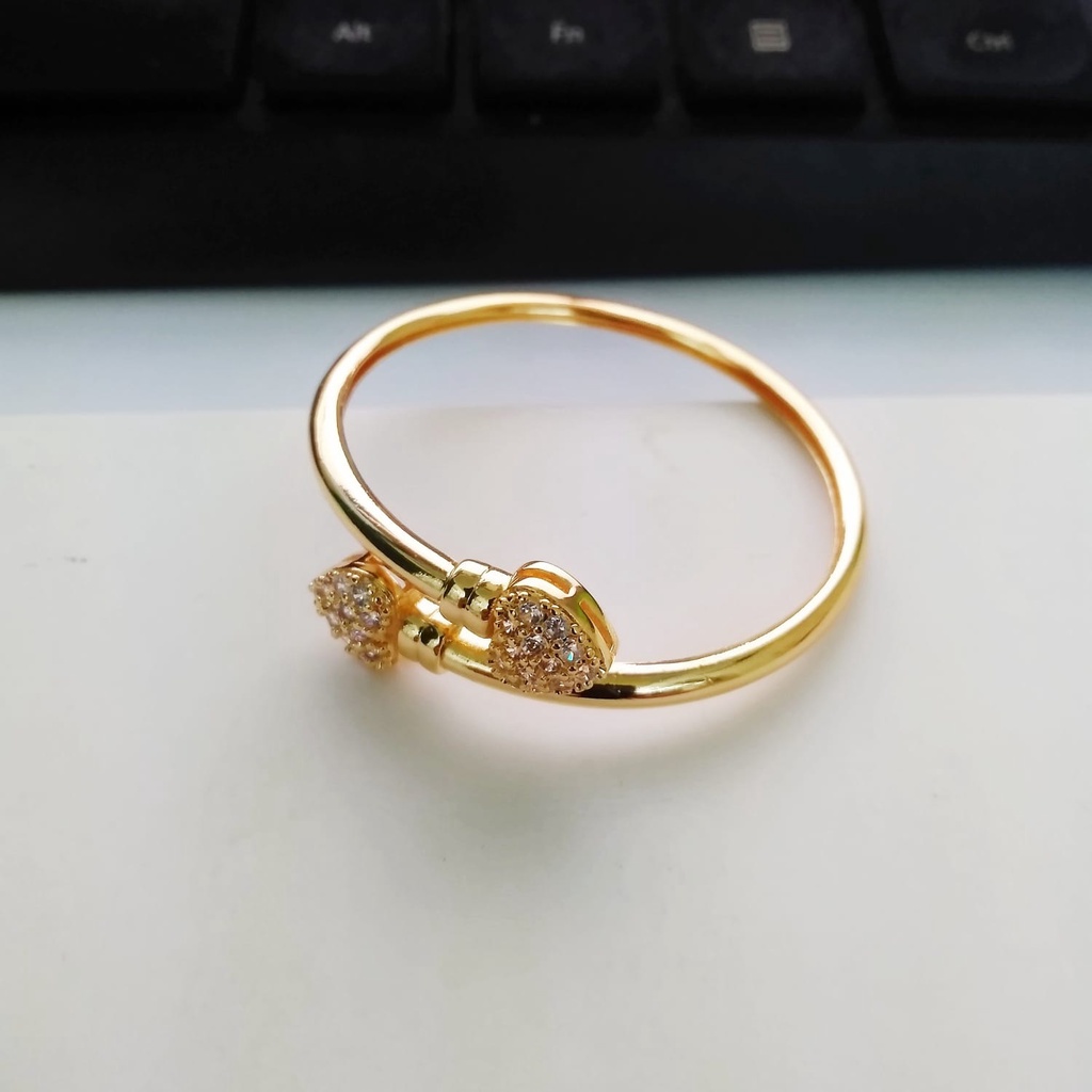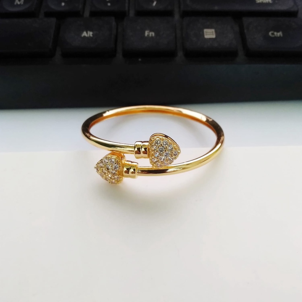 Harga tertera untuk 1 pcs Harga grosir Diameter 4 sampai 5 cm Gelang fleksibel bisa di besar kecilkan sesuai pergelangan tangan anak Kombinasi permata zircon motif love Bahan dasar tembaga lapis emas