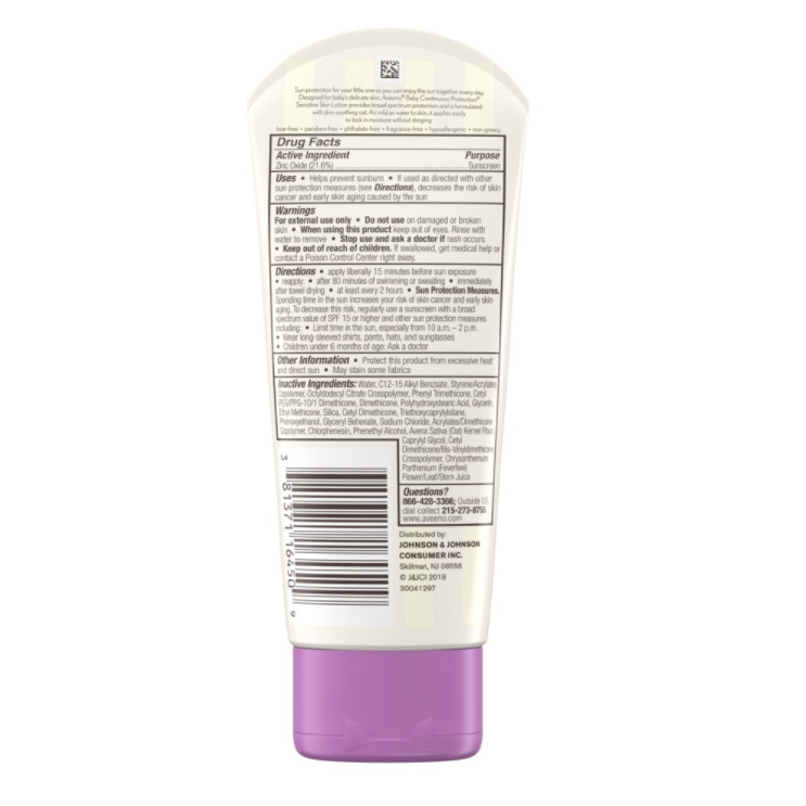 Pediatrician Recommended Brand Continuous Protection® Sensitive Skin Broad Spectrum SPF 50 Naturally-Sourced 100% Mineral Active Ingredient Sweat + Water Resistant (80 min) Tear-Free Paraben-Free Phthalate-Free Fragrance-Free Hypoallergenic Non-Greasy Sun protection for your little one so you can enjoy the sun together every day. Designed for baby's delicate skin, Aveeno® Baby Continuous Protection® Sensitive Skin Lotion provides broad spectrum protection and is formulated with skin-soothing oat. As mild as water to skin, it applies easily to lock in moisture without stinging.