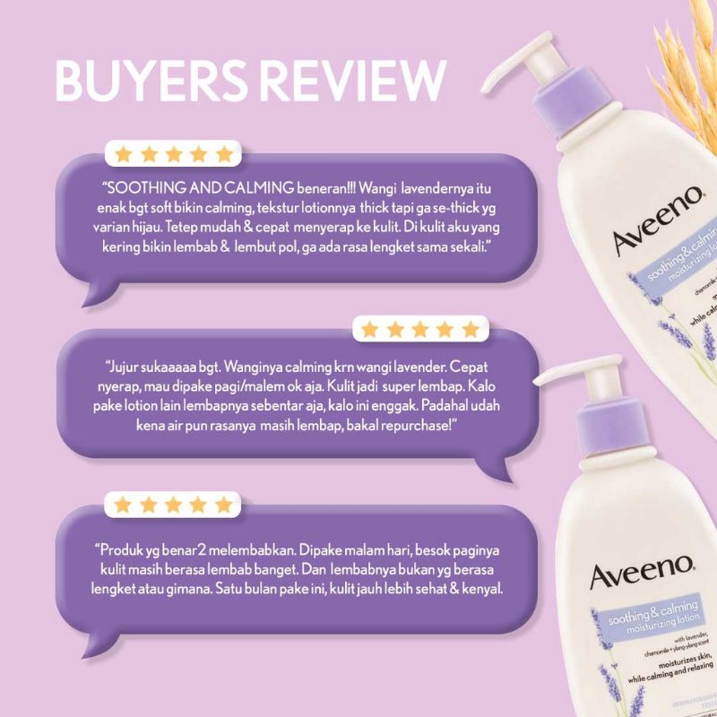 Aveeno Soothing & Calming Moisturizing Lotion [354 mL] merupakan lotion yang dapat menjaga kulitmu tetap tenang dan seimbang dengan keharuman dari Moisture Lotion Shooting & Calming. Formula gandum yang terkandung di dalamnya membantu mengunci kelembapan selama 24 jam penuh. Lotion unik ini memiliki wangi Lavender, Chamomile, dan minyak Ylang Ylang membantu menenangkan dan membuat relax ketika dioleskan di kulitmu. Cara Penggunaan :