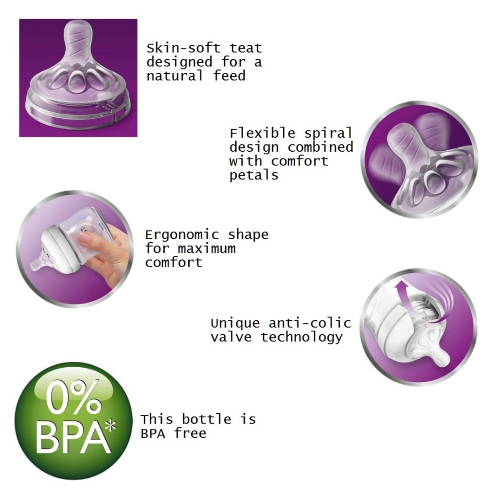 Fitur Avent Natural Bottle: Aliran susu dirancang agar menyerupai ritme hisapan bayi. Hal ini bertujuan agar bayi dengan mudah menyelaraskan pergantian antara menyusu langsung ke ibu atau menyusu menggunakan botol.