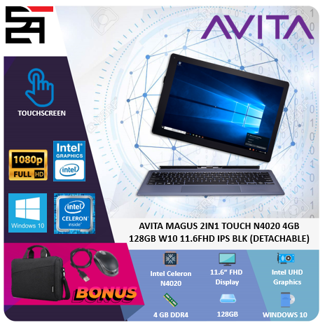 Operating System : Windows 10 Home Processor : Intel® Celeron® N4020 Display : 11.6″ (1920×1080 FHD) IPS Touch Screen Memory : 4GB DDR3 Graphics : Intel® HD Graphics 500 Storage : 128GB Audio : 1x Speaker Keyboard : English Travel Keyboard Wireless : IEEE 802.11 b/g/n/ac + Bluetooth v4.0 Dimension : 299mm (W) x 206mm (D) x 22mm (H) Overall weight : 1.41kg / Tablet weight: 1.07kg / Keyboard weight: 0.34kg Battery Life : Up to 8 hours I/O Ports : 1 x 3.5mm Headphone, 1 x USB 3.0, 1 x Mini-HDMI, 1 x microSD card Slot