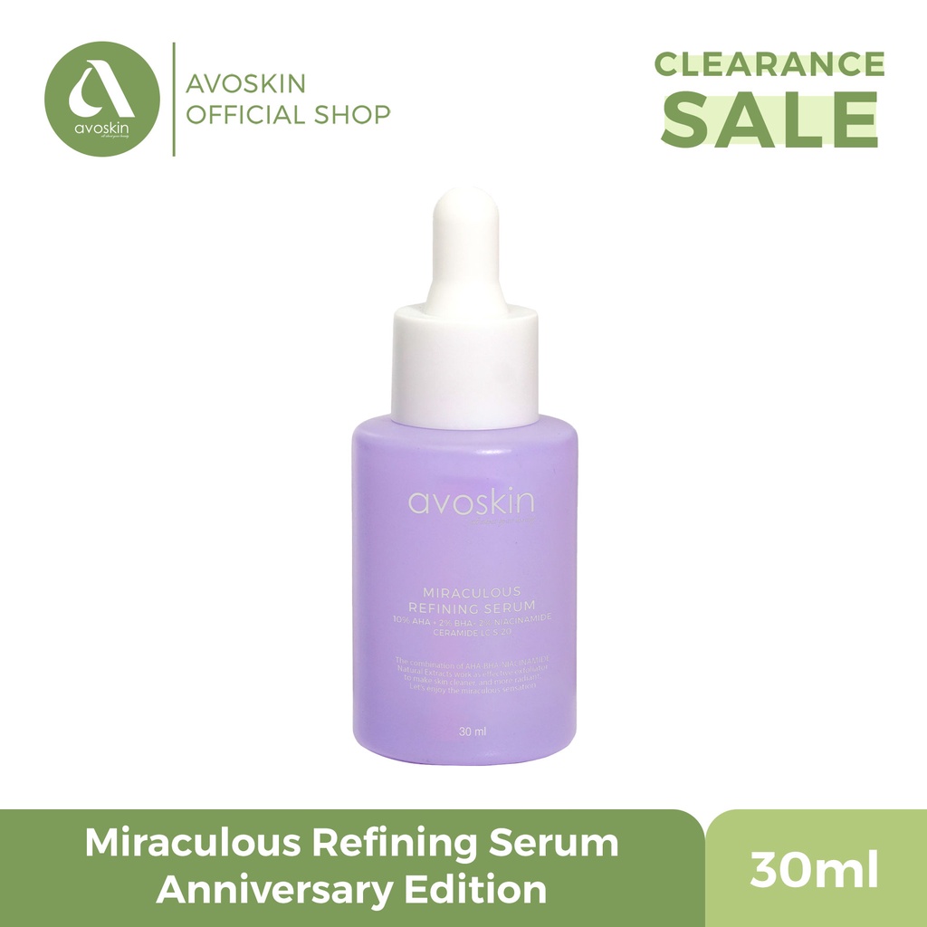 Avoskin Miraculous Refining Serum berfungsi sebagai exfoliating serum yang mengandung AHA dan BHA sebagai agen eksfoliator. Kandungan 2% niacinamide, ceramide, Polyglutamic Acid yang dilengkapi dengan ekstrak alami Raspberry, Aloe Vera, Seaweed, dan Chamomile berfungsi melembapkan sehingga kulit tetap terjaga kelembapannya setelah proses eksfoliasi. Pada produk Miraculous Refining Serum Special Anniversary Edition ini, terdapat penambahan kandungan PGA dan Ceramide yang berfungsi untuk meningkatkan kelembapan ekstra pada kulit dan merawat skin barrier.