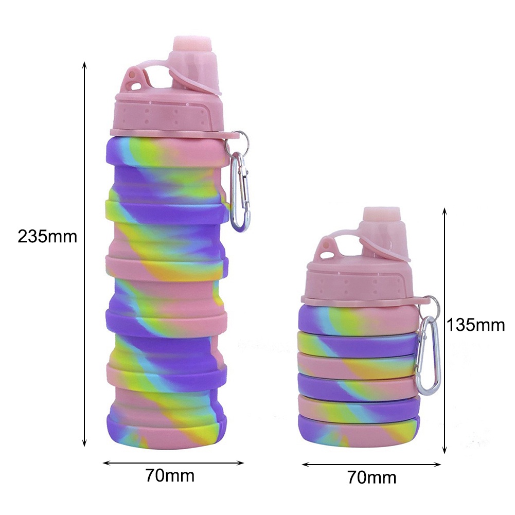 Spesifikasi : Material : Silicone food grade Warna : Blue Orange, Navy Blue, Pink Purple, Pink Blue Model : SL29475 Nama : Botol Minum Kapasitas Botol : 500ml Size : 23.5cm ditarik - 13.5cm lipat Isolasi termal : Tahan suhu tinggi 200℃, tahan suhu rendah -50℃