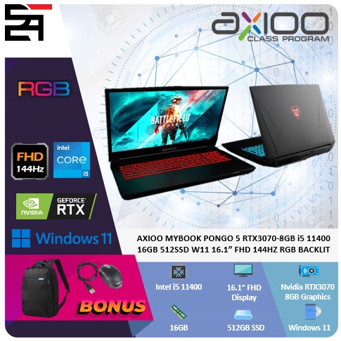 Processor : Intel® Core™ i5-11400 processor (2.6GHz,up to 4.4GHz, TDP: 65W) Chipset : Intel® H570 Graphics : NVIDIA® GeForce RTX™ 3070 Laptop GPU 8GB GDDR6 Display : 16,1" FHD 1920x1080 IPS 144Hz (16:9) Memory : 16GB 2 x SODIMM DDR4 Dual Channel memory up to 64GB,Frequency up to 3200MHz Storage : 512GB SSD,PCIe NVme Camera : 1.0M HD video camera Audio : HD Audio Built-in Microphone Power : AC in 100~240V, 50~60Hz, DC output 19.5V, 11.8A, 230W Battery : Removable 6 cells Smart Lithium-Ion battery pack, 56WH Wireless : Intel AX201 (Bands:2.4Ghz, 5Ghz 160Mhz) + Bluetooth 5.2 Keyboard : Backlit keyboard Speaker : 2 x Speakers Operating System : Windows® 11 (64-bit) Dimension : 378 (W) x267 (D) x30 (H) mm Weight : 2.7 kg I/O Ports : 1 x USB 3.2 Gen 2 port (Type C) 2 x USB 3.2 Gen 2 port (Type A) 1 x USB 2.0 port 2 x Mini Display 1.4 port 1 x HDMI output port (with HDCP) 1 x 2-in-1 3.5mm Audio Jack (Headphone / Microphone) 1 x 2-in-1 3.5mm Audio Jack (Microphone / S/PDIF optical) 1 x RJ-45 LAN port 1 x SDCard reader 1 x DC-in jack