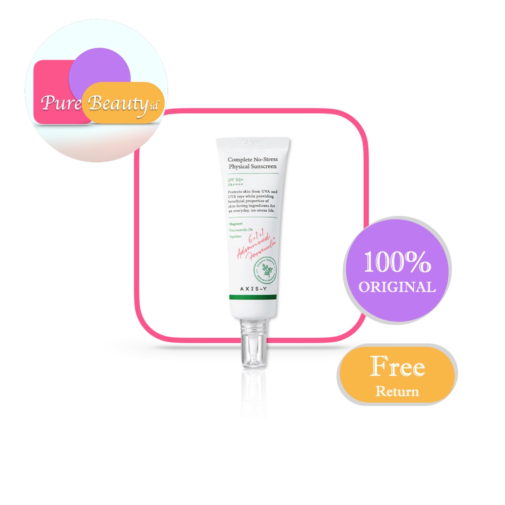 AXIS-Y Complete No-Stress Physical Sunscreen adalah physical sunscreen berbasis Mugwort yang membantu melawan kerusakan akibat sinar UVA and UVB yang menyebabkan luka bakar, penuaan dini, dan kanker kulit; melindungi kulit glowing tanpa stres; dan mengandung bahan-bahan penyembuhan alami yang melindungi kulit dari radikal bebas, menjaga kulit kita terasa dan terlihat sehat.