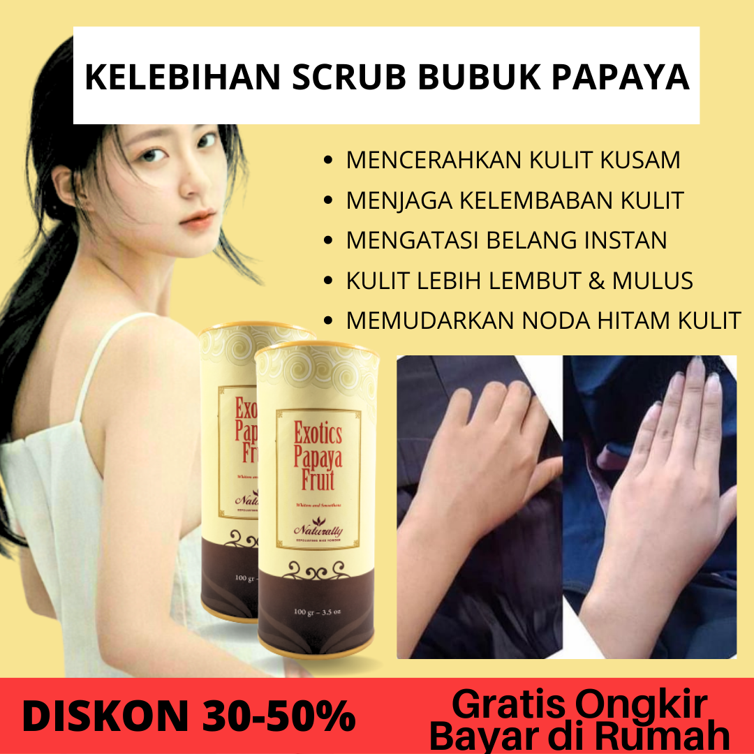 Exotics Papaya Fruit Rice Powder_x000D_ _x000D_ Helps in skin lightening, as papain enzyme in Papaya renews and brighten skin._x000D_ Suitable for : All Skin Type_x000D_ Applications : Apply to skin using small circular movements, avoiding the eye area. Wait 5 minutes, _x000D_ Rinse thoroughly or ( for best result, instead of mixing with water, mix our exfoliating rice powder with our Naturale Brightening Cream)_x000D_ Available in : 100gr_x000D_ Contains : Rice Powder, Red Rice, Soya bean, Green bean, herbal and flower extract, zea mays starch, avena sativa flour, carica papaya fruit extract_x000D_ _x000D_ Tersedia dalam varian : Green Tea (anti-oxidant), Balinese Coffee (firming & glowing), Herbal Spa (renewal & relaxation), Tropical Spicy (warming & improve circulation), Exotic Papaya Fruit (whitens & smoothes)