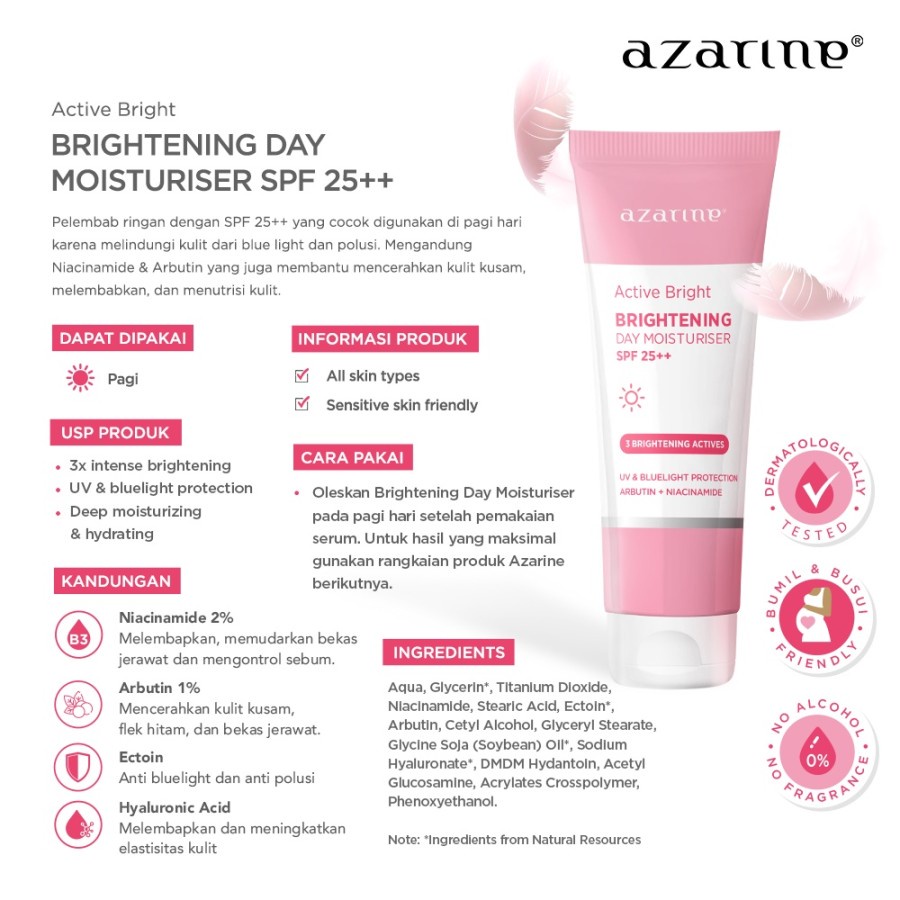 ❤ Day Cream for Brightening with NIACINAMIDE 2% + ARBUTIN 1% + SPF 25++ Krim siang untuk mencerahkan sekaligus merawat kesehatan skin barrier kulit. Dengan perlindungan lengkap dari sinar UV, polusi dan bluelight agar kulit tampak glowing dan awet muda. Pelembab ini sangat ringan, tidak lengket dan memiliki kadar SPF 25. Di formulasikan dengan berbagai bahan aktif agar kulit senantiasa lembab dan terlindungi. Moisturiser ini untuk semua jenis kulit dan boleh di gunakan usia 12 tahun ke atas. Manfaat: - Mencerahkan kulit kusam, warna kulit tidak rata - Memudarkan bekas jerawat/ flek hitam - Melindungi dari sinar UV matahari, polusi dan bluelight - Merawat dan memperbaiki skin barrier - Antioksidan dan melembabkan kulit (no parfume, no alcohol) Full Ingredients: Aqua, Glycerin *, Titanium Dioxide, Niacinamide, Stearic Acid, Ectoin*, Arbutin, Cetyl Alcohol, Glyceryl Stearate, Glycine Soja (Soybean) Oil*, Sodium Hyaluronate*, DMDM Hydantoin, Acetyl Glucosamine, Acrylates Crosspolymer, Phenoxyethanol