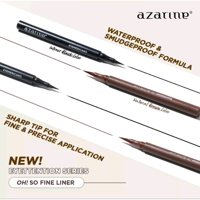 Keunggulan Eyeliner Azarine: 1. Super intense color 2. Waterproof & smudgeproof formula 3. Sharp tip for fine & precise application 4. Beginner Friendly with sponge applicator 5. Matte finish & quick dry formula