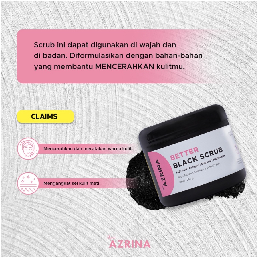 Better Black Scrub dapat mengatasi permasalahan kulit kusam, tidak merata (belang), kulit bertekstur dan kulit kering.