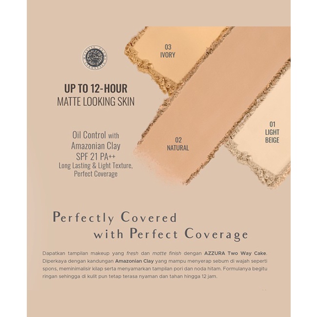 Perfectly Covered with Perfect Coverage, dapatkan tampilan makeup yang fresh dan matte finish dengan AZZURA Two Way Cake. Diperkaya dengan kandungan Amazonian Clay yang mampu menyerap sebum di wajah seperti spons, meminimalisir kilap serta menyamarkan tampilan pori dan noda hitam. Formulanya begitu ringan sehingga di kulit pun tetap terasa nyaman dan tahan hingga 12 jam
