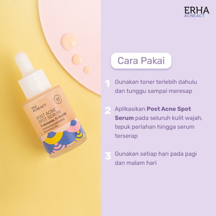 B1G1 Erha Acneact Spot Serum 30ml - Krim Menyamarkan Bekas Jerawat Wajah Join Member Erha Official Store Sekarang! Dapatkan Voucher Cashback hingga 50.000 Pada Pembelian Selanjutnya. *Produk Erha sudah tersertifikasi HALAL oleh MUI dengan no registrasi 00150086800118 Erha Acneact Spot Serum Niacinamide, TXA & PAD 30ml - [BPOM NA18210104891] ED: Jan 2024 Manfaat: - Membantu mencerahkan kulit sehingga noda hitam dan kemerahan bekas jerawat memudar - Diperkaya dengan kandungan Calamine yang memberikan warna natural merah muda dan membantu menenangkan kulit. Bahan Aktif: - Niacinamide, Tranexamic Acid dan PAD (Potassium Azeloyl Diglycinate) Berfungsi sebagai brightening agent yang bekerja sinergis membantu mencerahkan dan memudarkan hiperpigmentasi pada kulit terutama pada area bekas jerawat. - Salicylic acid Berfungsi sebagai antibakteri (melawan bakteri penyebab jerawat : P. Acnes) dan comedolytic agent untuk mengangkat minyak dan kotoran penyumbat pori dan menghambat pembentukan microcomedones sekaligus mencegah dan mengatasi pembentukan jerawat baru. - Glycolic acid Berfungsi sebagai Mild Exfoliating Agent yang merupakan golongan Alpha- Hydroxy Acid yang membantu mengangkat sel kulit mati sehingga merangsang regenerasi sel kulit baru dan memperbaiki tekstur kulit. - Allantoin, 7 Kombinasi ekstrak tanaman, dan Calamine Centella Asiatica Extract, Chamomilla Recutita (Matrica) Flower Extract , Glycyrrhiza Glabra (Licorice) Root Extract, Camellia Sinensis Leaf Extract, Polyganum cuspidatum Leaf Extract, Rosmarinus Officinalis (rosemary) Leaf Extract, Scutellaria Baicalensis Root Extract Berfungsi sebagai soothing agent untuk membantu menenangkan kulit merah dan teriritasi ringan pada area bekas jerawat. - Squalane, Niacinamide, dan Shea butter Berfungsi sebagai moisturizing agent yang membantu menjaga kelembapan dan menghidrasi kulit.