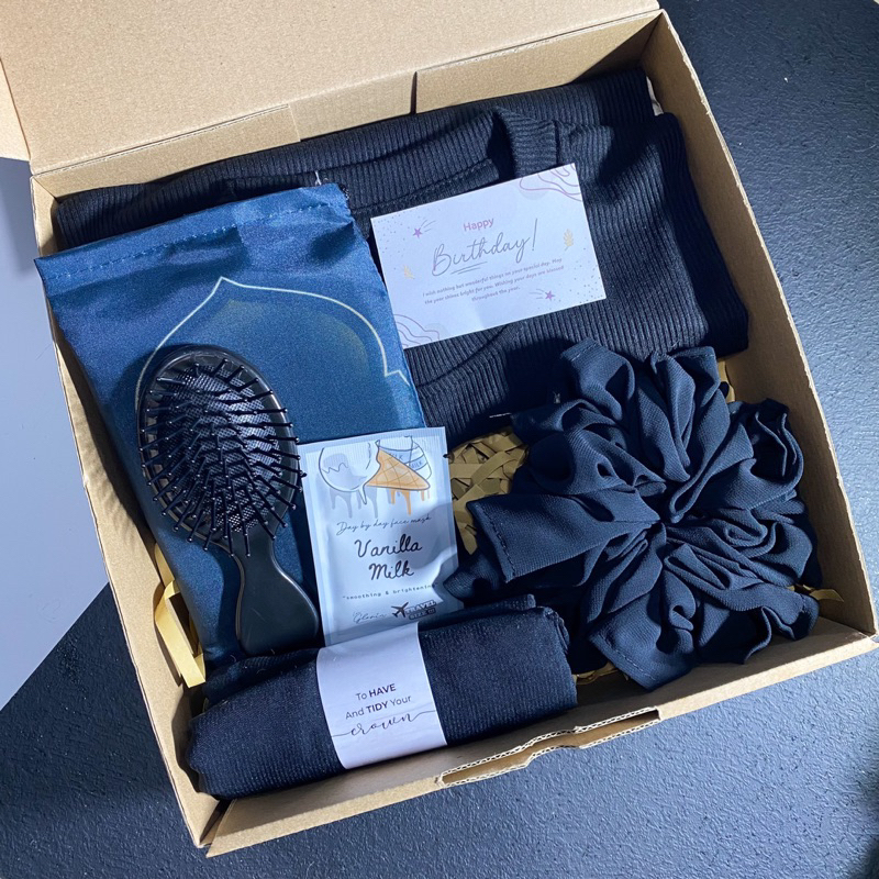 Isi box sesuai di gambar: - Kaos cotton ribb 2x1 (halus tebal dan lentur, nyerap keringat) ✨fit to L mau BB 70kg ✨Lingkar Dada : 100cm ✨Panjang Baju : 70cm ✨Panjang Lengan : 59cm - Sajadah Travel - Masker Lea 10gr - Scrunchie - Sisir - Jilbab Segi Empat Bella Square Lasercut - Free greeting card (untuk request greeting card, silahkan kirim kata-katanya di kolom pesan/chat)