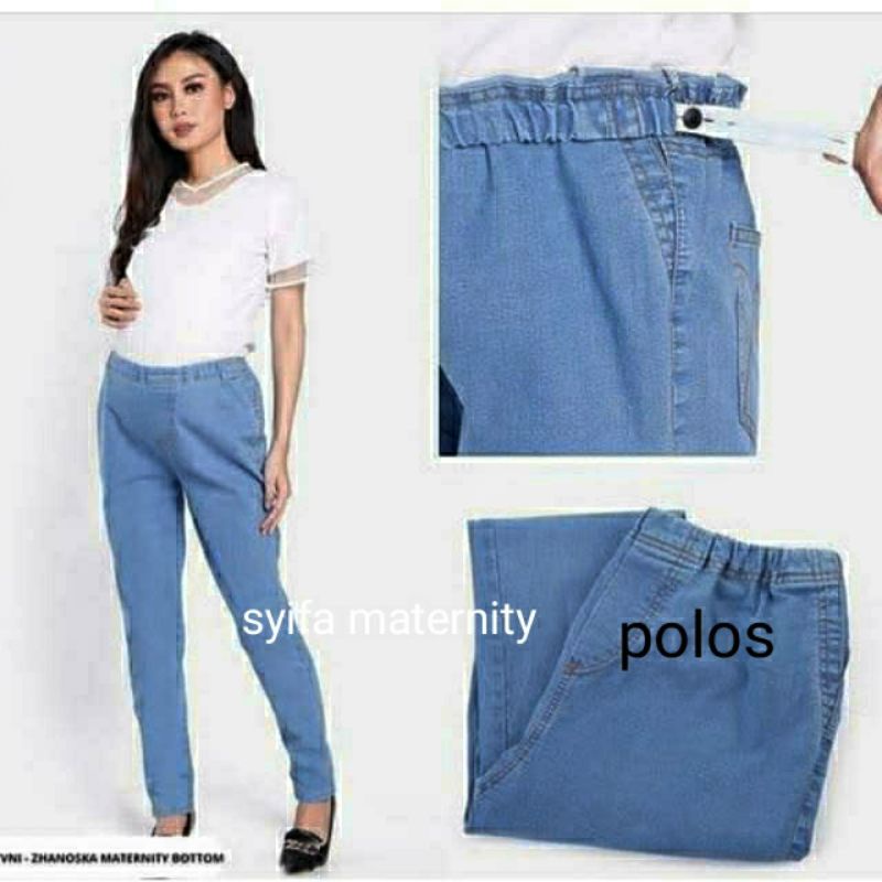 bahan jeans strecht tebal yang nyaman dipakai untuk bumil.. ada karet pengatur, jadi bisa menyesuaikan besar kecilnya perut. 2 saku belakang