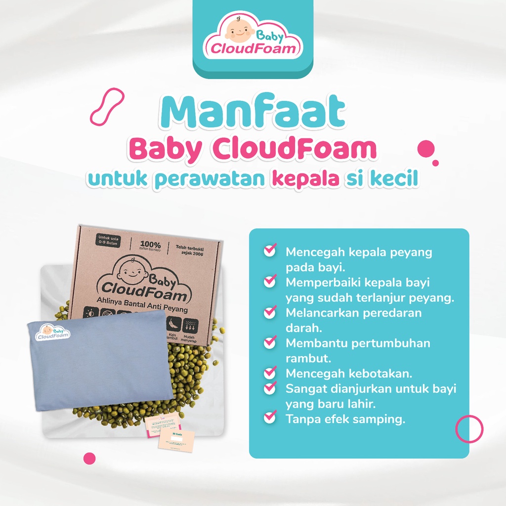 Baby Cloudfoam dibuat dari bahan alami tanpa melalui proses kimia. Kulit kacang hijau telah diolah sedemikian rupa sehingga sesuai dengan kepala bayi yang masih lunak, juga berfungsi untuk memijat kepala bayi secara alami dan akan melancarkan aliran/peredaran darah di kepala bayi yang akan bermanfaat untuk pertumbuhan rambut bayi serta pembentukan tulang kepala/tengkorak kepala bayi