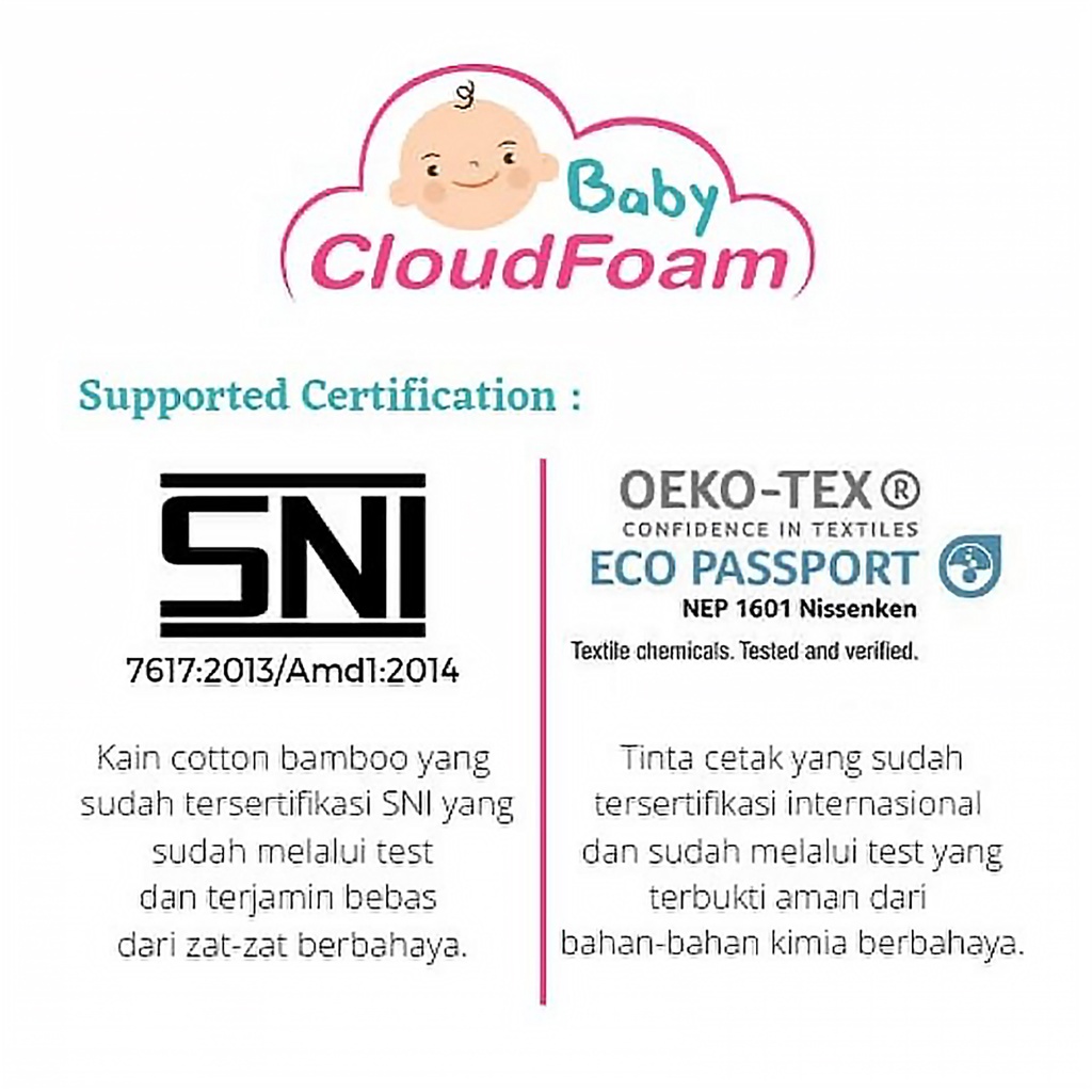 Baby Cloudfoam dibuat dari bahan alami tanpa melalui proses kimia. Kulit kacang hijau telah diolah sedemikian rupa sehingga sesuai dengan kepala bayi yang masih lunak, juga berfungsi untuk memijat kepala bayi secara alami dan akan melancarkan aliran/peredaran darah di kepala bayi yang akan bermanfaat untuk pertumbuhan rambut bayi serta pembentukan tulang kepala/tengkorak kepala bayi