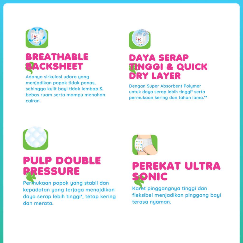 Detail: - Popok bayi pants - Tidak menyebabkan iritasi - Daya serap tinggi - Mampu menyerap cairan dengan cepat dan anti-bocor - Menjaga kulit bayi Anda tetap kering - Ukuran L, berat badan bayi 9-14 kg - Isi 20pcs