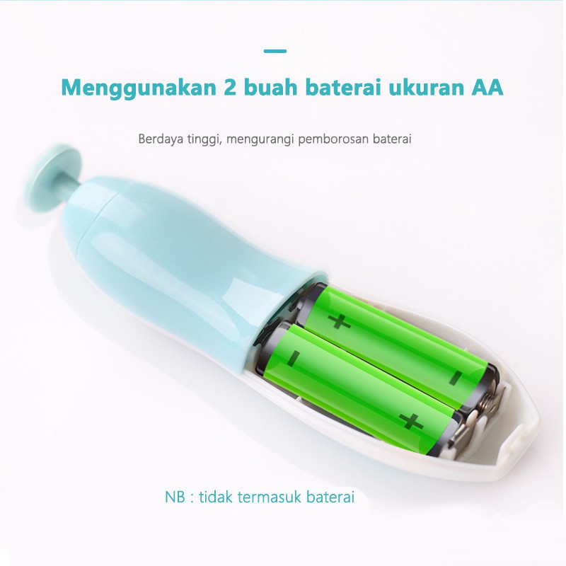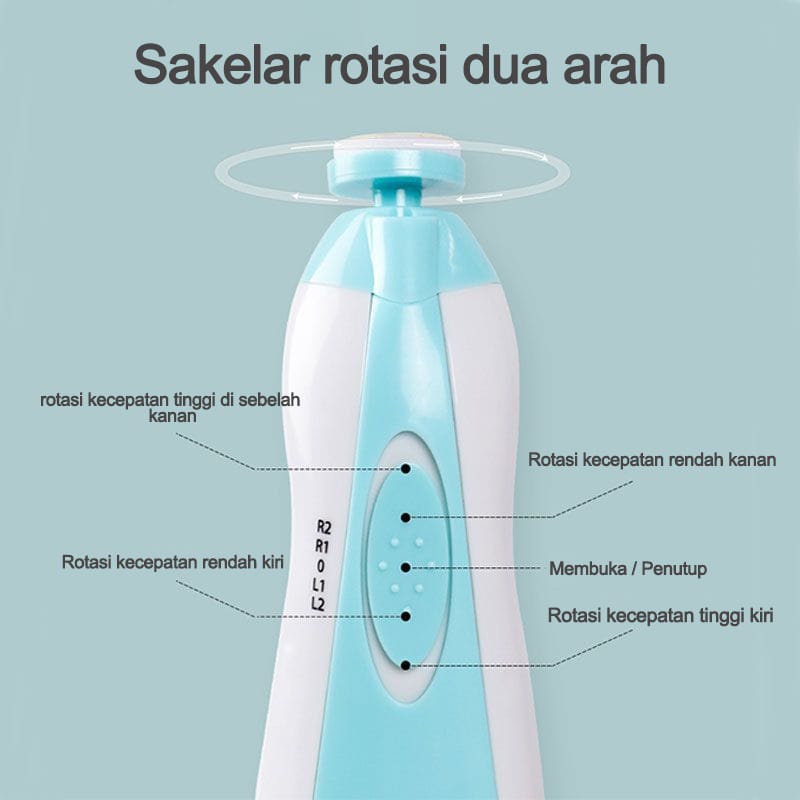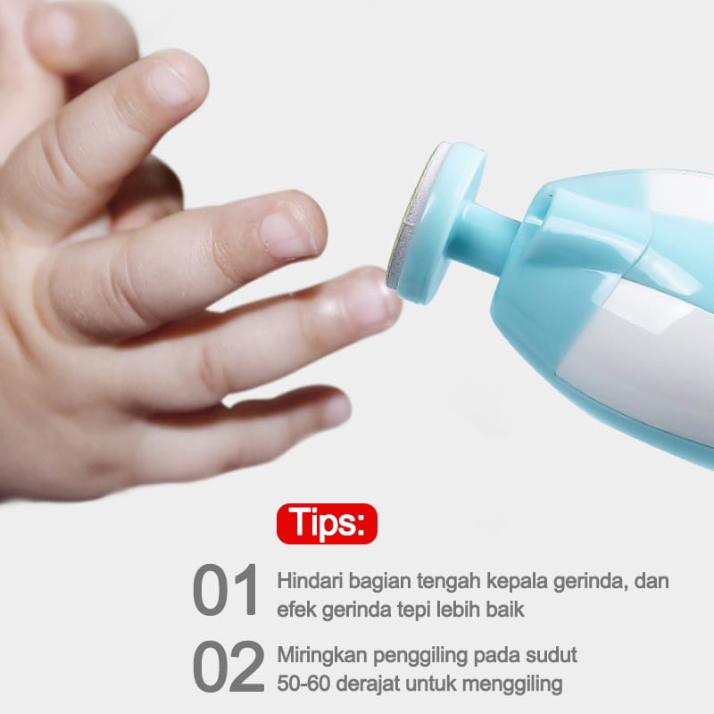 Cara menggunakan : -Pasang baterai tipe AA sebanyak 2pcs (PAKET TIDAK TERMASUK BATERAI) -Pilih grinding (kepala ) sesuai dengan umur baby -Pasang kepala gerinda ke bagian atas unit untuk beralih kepala cukup tarik yang saat ini mati dan ganti -Pegang jari / jari kaki bayi Bunda dan rapikan kuku