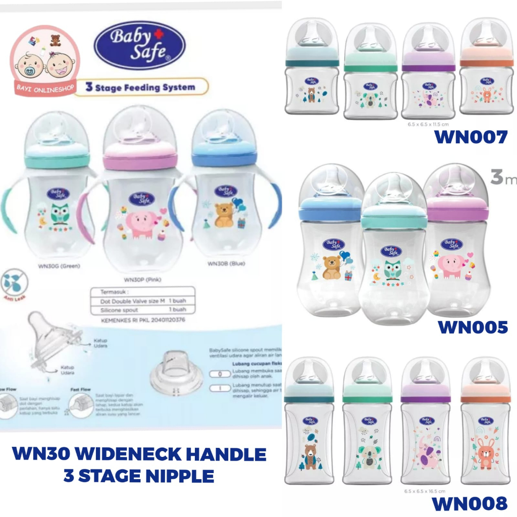 BabySafe Wide Neck Bottle merupakan botol susu bayi dengan leher lebar. Dotnya memiliki katup udara ganda. Katup mengalirkan udara masuk ke dalam botol agar aliran susu lancar (bukan untuk di telan bayi). Aliran susu yang lancar mencegah dot kempes saat dihisap, sehingga bayi menyusu dengan nyaman. Dot ini dapat menyesuaikan aliran susu sesuai dengan daya hisapan bayi, yaitu Slow Flow atau Fast Flow. Slow flow, saat bayi menghisap dot dengan perlahan, hanya satu katup yang terbuka. Fast Flow, saat bayi lapar dan menghisap dot dengan lahap, kedua katup akan terbuka menghasilkan aliran susu yang lebih banyak. Bentuk dotnya natural menyerupai payudara Ibu, serta tektur silicone yang lembut dan kenyal untuk dihisap bayi.