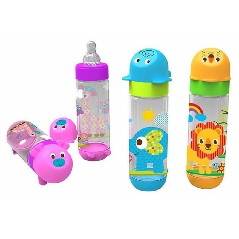 Spesifikasi: Rekomendasi Usia : Usia 4 bulan keatas Ukuran : 250 ml Warna : Jerapah (ungu), Gajah (biru), dan Harimau (orange). Kemasan : Mica Box Material : Polypropylene (PP) BPA Free & Silicone (dot / sedotan). Keistimewaan: - Aman Food Grade Bottle Bebas dari Bisphenol-A (BPA Free) Certified by European Safety Standard Terdaftar di Kemenkes RI - Anti Colic air-flow system Menahan udara masuk selama proses minum susu untuk mencegah kembung. - Support Teeth & Jaw Development Bentuk, bahan silikon dan tekstur dot dapat mendukung perkembangan gigi dan rahang - Attractive Bottle Desain botol menarik menyerupai bentuk hewan, dapat diposisikan berdiri dan tidur tanpa bocor.
