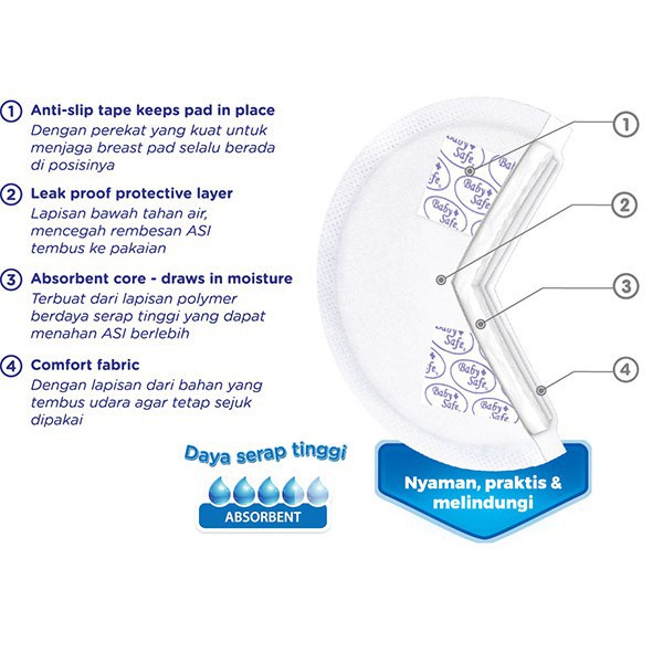 BabySafe Breast Pad adalah bantalan penyerap kelebihan air susu Ibu (ASI) agar tidak merembes dan membasahi pakaian Ibu. Terbuat dari lapisan polymer berdaya serap tinggi, menyerap dan menahan ASI berlebih sehingga menjaga kulit Ibu tetap kering. Breast pad ini memiliki lapisan bawah tahan air untuk mencegah rembesan ASI tembus ke pakaian. Dilengkapi dengan perekat yang kuat untuk menjaga breast pad agar tidak bergeser saat dipakai. Lapisan bahannya tembus udara, sehingga tetap sejuk saat digunakan.