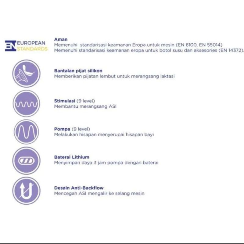 Mesin breastpump ini memiliki fitur auto memory untuk menyimpan setting terakhir pakai. Lulus uji standarisasi keamanan Eropa untuk mesin dan botol susu.