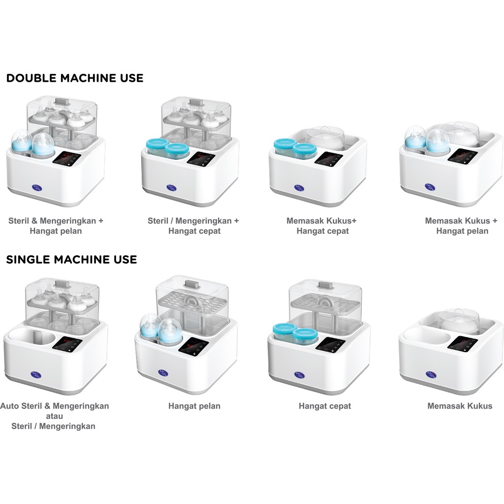 Merupakan mesin digital multifungsi paling lengkap. Terdiri dari 2 mesin yang dapat beroperasi bersamaan. -Mesin 1 untuk sterilisasi & auto dry atau sterilisasi/dry saja, steam cooking dan storage (menyimpan dengan pengeringan berkala). -Mesin 2 untuk warming (menghangatkan) dengan opsi fast warming dan slow warming.