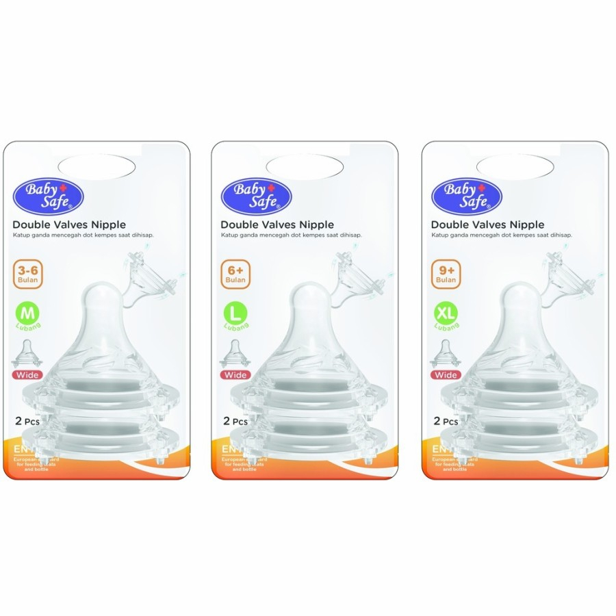 Double Valves Wide Neck Nipple adalah dot untuk botol leher lebar, yang memiliki katup udara ganda untuk mencegah dot kempes saat dihisap bayi. Katup mengalirkan udara masuk ke dalam botol agar aliran susu lancar (bukan untuk di telan bayi) . Aliran susu yang lancar mencegah dot kempes saat dihisap, sehingga bayi menyusu dengan nyaman. Dot ini dapat menyesuaikan aliran susu sesuai dengan daya hisapan bayi, yaitu Slow Flow atau Fast Flow. Slow flow, saat bayi menghisap dot dengan perlahan, hanya satu katup yang terbuka. Fast Flow, saat bayi lapar dan menghisap dot dengan lahap, kedua katup akan terbuka menghasilkan aliran susu yang lebih banyak. Bentuk dotnya natural menyerupai payudara Ibu, serta tektur silicone yang lembut dan kenyal untuk dihisap bayi. Tersedia dalam ukuran lubang S, Medium (M), Large (L), XL
