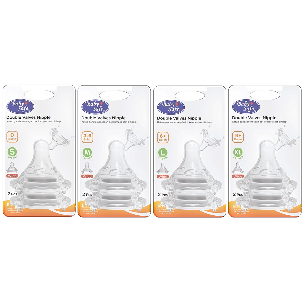 Double Valves Wide Neck Nipple adalah dot untuk botol leher lebar, yang memiliki katup udara ganda untuk mencegah dot kempes saat dihisap bayi.