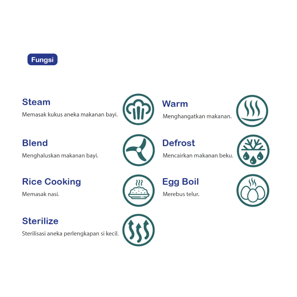 Fungsi: - Steam - Blend - Warm - Defrost - Rice Cooking - Egg Boil - Sterilize Aman Food Grade Material Bebas dari Bisphenol-A (BPA FREE) Lulus standar keamanan internasional 7 in 1 Food Maker 7 Fungsi dalam 1 mesin yaitu kukus, blender, memasak nasi, menghangatkan, mencairkan (defrost), rebus telur, dan sterilisasi. 360° Steam Heating for Nutricious Meal Memasak makanan sehat dengan sistem pemanasan menyeluruh 360°, membuat semua sisi makanan terkukus dengan baik. Food Grade Material Mangkuk kukusnya terbuat dari bahan yang tahan panas, Bebas BPA dan aman digunakan untuk membuat makanan bayi. Stainless Steel Blade Pisau berbahan stainless dengan 2 mata pisau, sehingga mampu menghaluskan makanan sampai lembut. Thermostate Control Mesin akan mati sendiri apabila air tangki habis atau kering, sehingga tidak menyebabkan mesin gosong. Daya : Kukus 300W Blender 110W