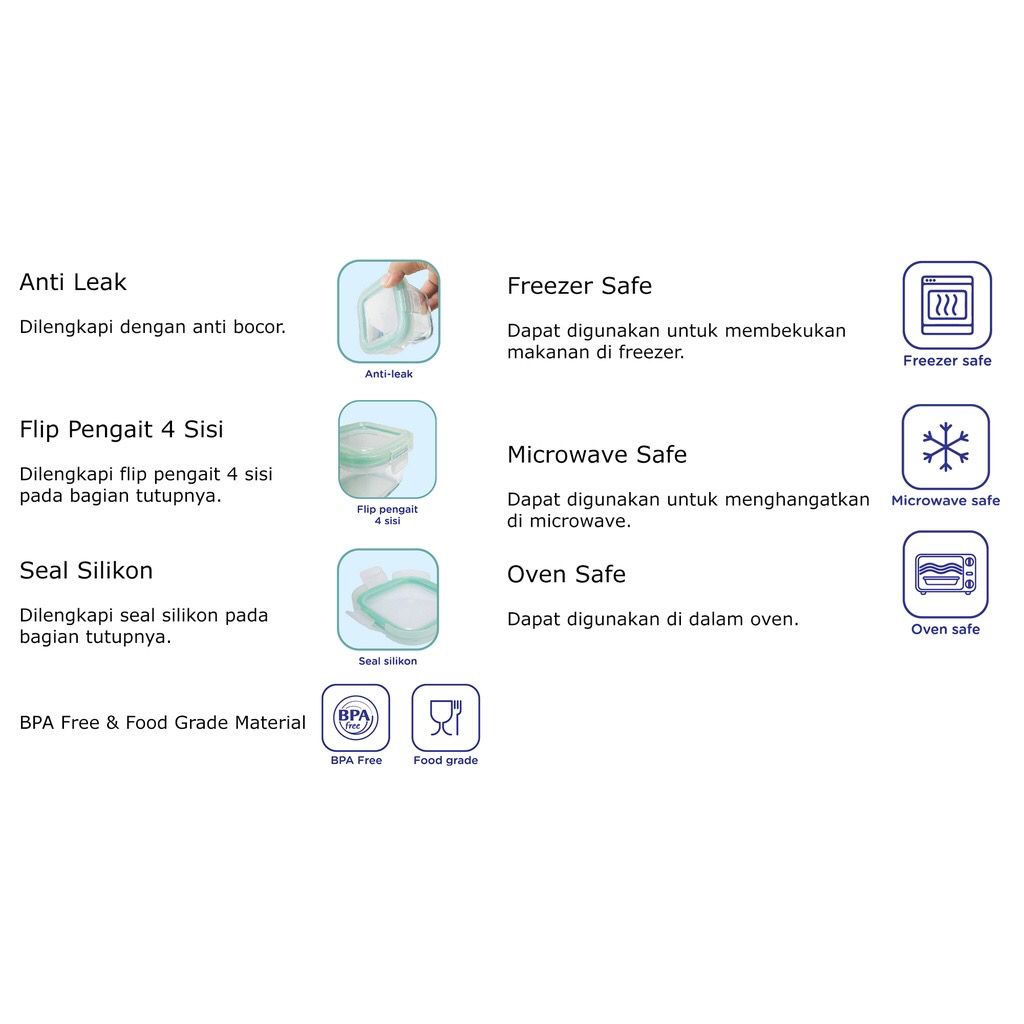 Wadah ini juga anti bocor, dilengkapi flip pengait di 4 sisi dan seal silikon pada bagian tutupnya. Jadi aman dan tidak mudah tumpah walaupun untuk dibawa – bawa.