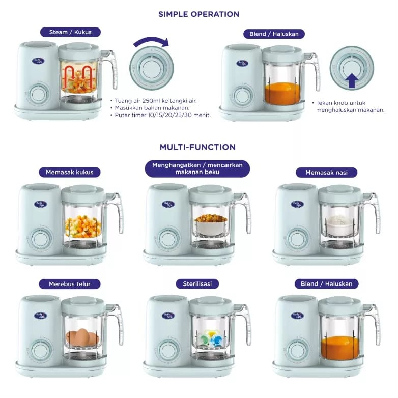 Merupakan mesin memasak aneka makanan bayi yang memiliki 7 fungsi di dalam satu mesin yaitu kukus, blender, memasak nasi, menghangatkan, mencairkan (defrost), rebus telur dan sterilisasi.