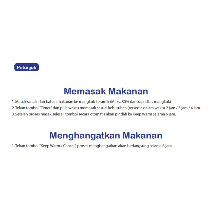 Cara Penggunaan Memasak Makanan: 1. Masukkan air dan bahan makanan ke mangkok keramik (Maks. 80% dari kapasitas mangkok) 2. Tekan tombol Timer dan pilih waktu memasak sesuai kebutuhan (tersedia dalam waktu 2 jam / 3 jam / 4 jam. 3. Setelah proses masak selesai, tombol secara otomatris akan pindah ke Keep Warm selama 6 jam.