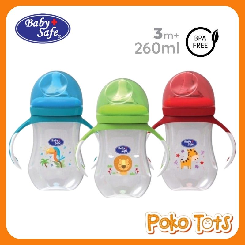 Baby Safe Wide Neck Bottle Kapasitas: 260ml Usia : 3m+ Bebas dari Bisphenol-A (BPA Free) Memenuhi standar keamanan internasional Terdaftar di Kemenkes RI PKL 20401220168 Dot dengan Katup udara ganda, mencegah dot kempes saat dihisap bayi
