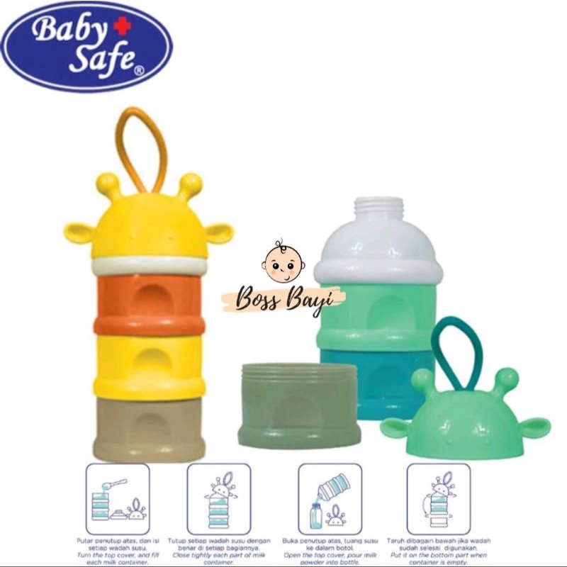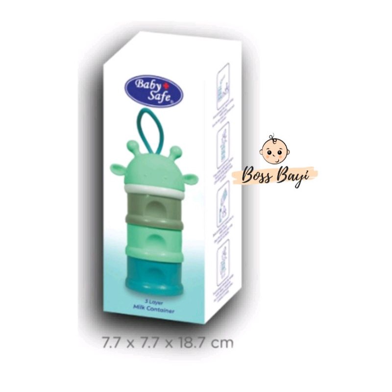 BabySafe Milk Container merupakan wadah untuk menyimpan susu bubuk. Terdiri dari 3 tumpuk wadah yang masing-masing dapat dilepaskan. Desain wadahnya lucu dan praktis, dapat menampung susu bubuk sesuai takaran yang dibutuhkan. Terbuat dari bahan food grade dan BPA Free yang aman untuk si kecil.