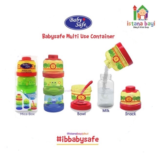 BabySafe Multi Use Containers adalah wadah tempat penyimpanan yang multi fungsi. Terdiri dari 3 tumpuk wadah yang masing-masing dapat dilepaskan untuk digunakan sebagai tempat menyimpan susu bubuk, mangkuk makan, maupun tempat snack untuk si kecil. BabySafe milk use container memenuhi standar keamanan international untuk peralatan makan anak serta bahannya BPA free. Cocok untuk dibawa saat mengajak si kecil berpergian.