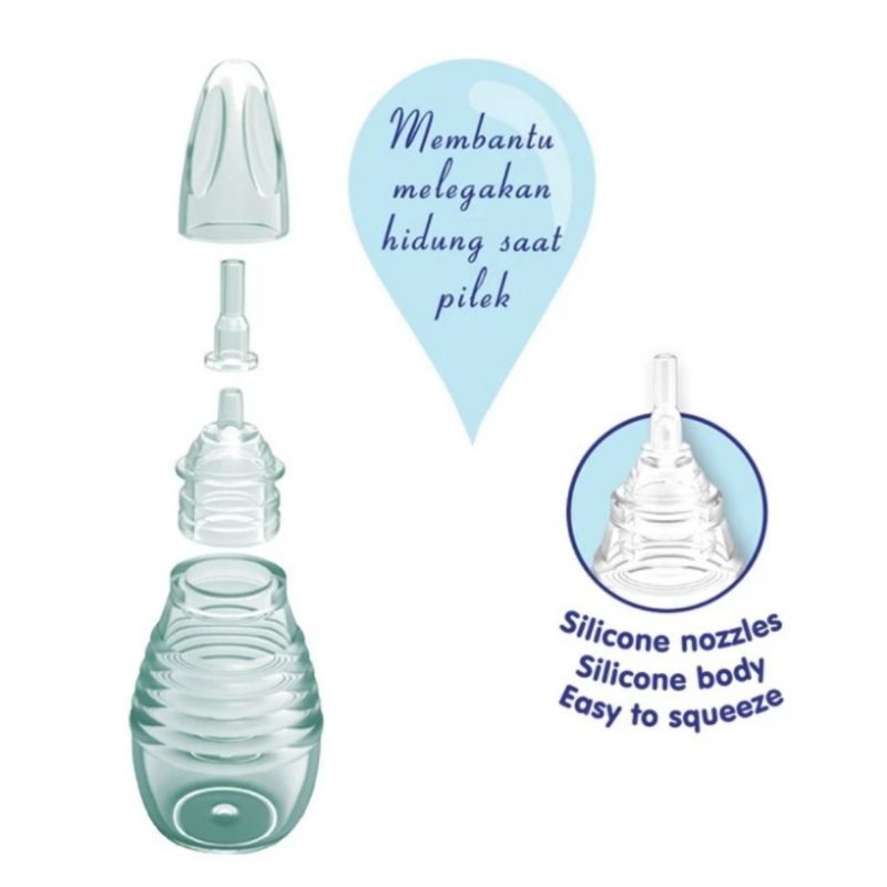Nasal Aspirator merupakan alat untuk menyedot lendir (ingus) dari hidung bayi, sehingga pernafasan bayi lebih lega. Ujung aspirator terbuat dari bahan silikon yang lembut, aman tersentuh hidung bayi . Tube aspirator terbuat dari bahan silikon elastis, sehingga mudah ditekan saat menyedot lendir dari hidung bayi. Setiap bagian Nasal Aspirator dapat dilepaskan untuk memudahkan dibersihkan. Dilengkapi dengan tutup, sehingga lebih higienis. Terbuat dari bahan BPA Free dan memenuhi standar keamanan nasional dan internasional EN 14372 untuk penggunaan peralatan perawatan anak.