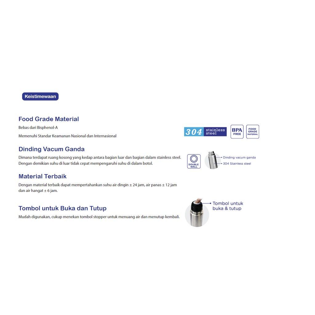 praktis untuk dibawa kemana saja...bisa jg dimasukan kedlm tas anda.. Material Stainless Steel menggunakan bahan yang aman untuk tempat minuman/makanan yaitu Food Grade SUS304 18/8 Stainless Steel yang akan menjaga kualitas minuman/makanan Anda menjadi lebih baik. Selain itu, produk ini juga memiliki daya tahan yang sangat baik dimana dapat bertahan hingga suhu 60 derajat Celcius selama 6 jam, dan suhu 42 derajat Celcius selama 12 jam. Bebas BPA