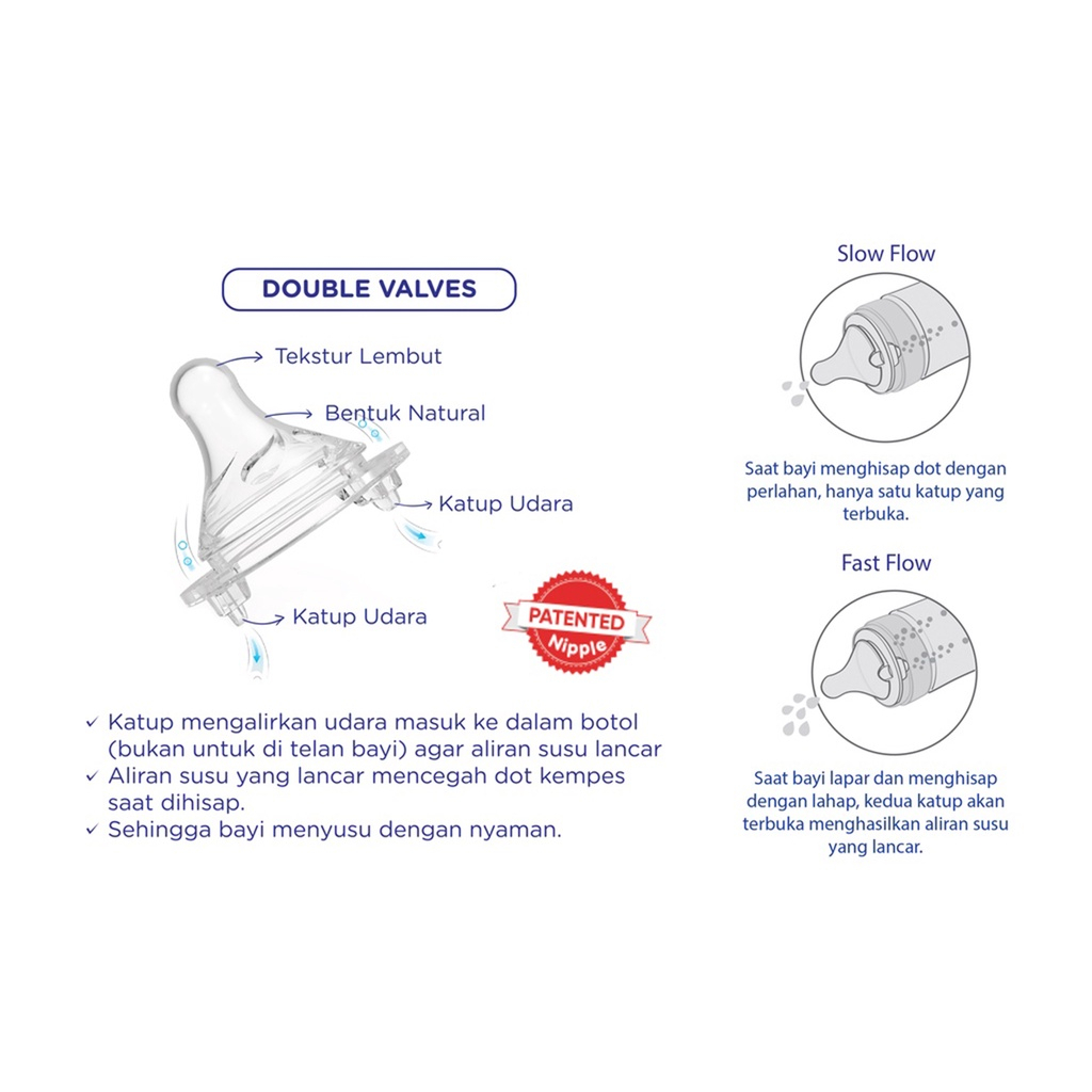 Botol susunya memiliki dot dengan katup udara ganda yang dapat menyesuaikan aliran susu dengan daya isap bayi. Slow flow, saat bayi mengisap dot dengan perlahan, hanya satu katup yang terbuka. Fast Flow, saat bayi lapar dan mengisap dot dengan lahap, kedua katup akan terbuka menghasilkan aliran susu yang lebih banyak. Aliran susu yang lancar mencegah dot kempes saat diisap, jadi si kecil dapat menyusu dengan nyaman.