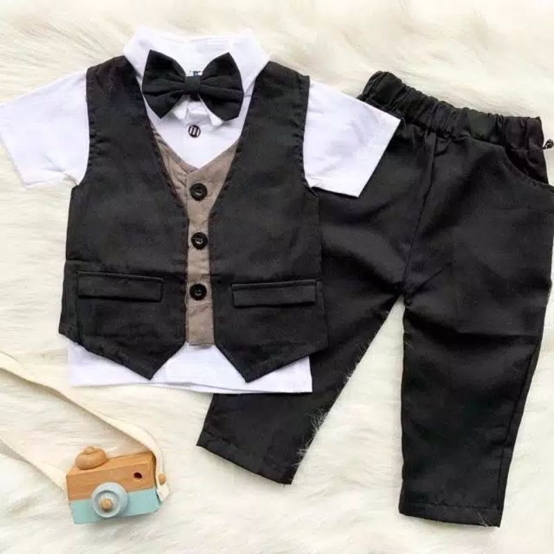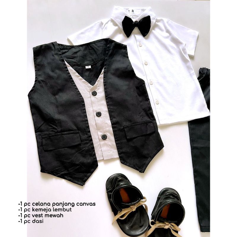 Terdiri dari: -1 pc kemeja lembut -1 pcs celana panjang -1 pc dasi -1 pc rompi vest 2 lapis mewah *SEPATU TIDAK TERMASUK*